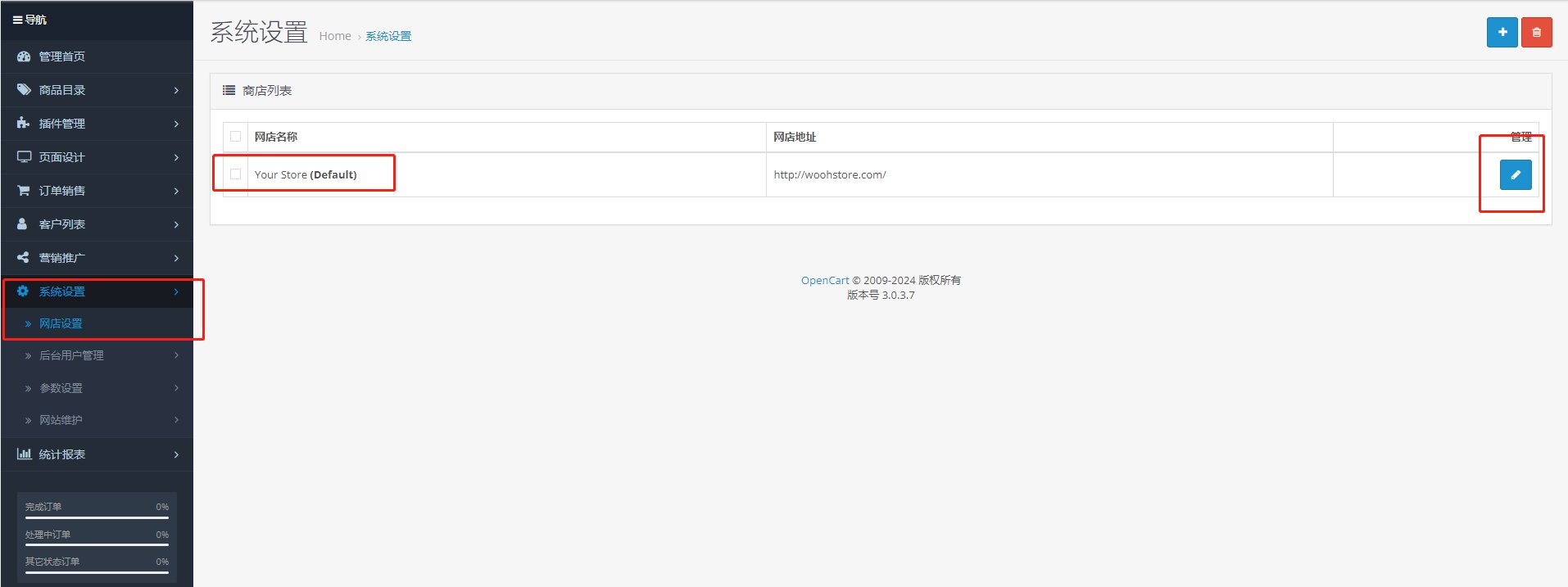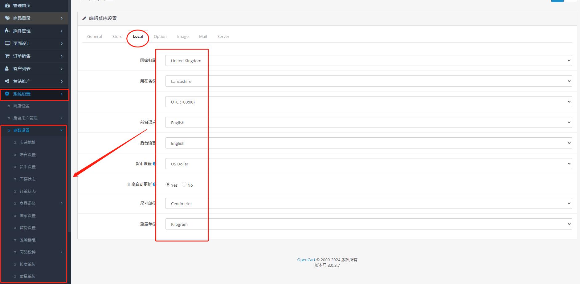 01设置国家 地区 网站默认语言,货币,尺寸重量(单位)等 可在左侧参数设置中修改或添加