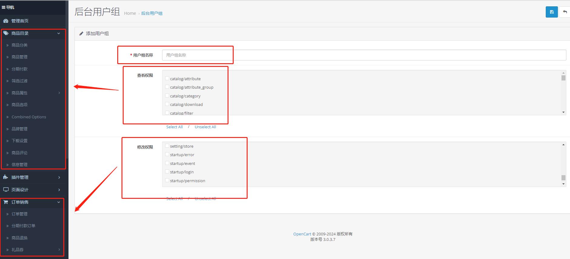 点击上图中的+可添加新的管理员群组,赋予部分权限,以业务员群组为列 赋予操作产品跟订单权限,如下图所示