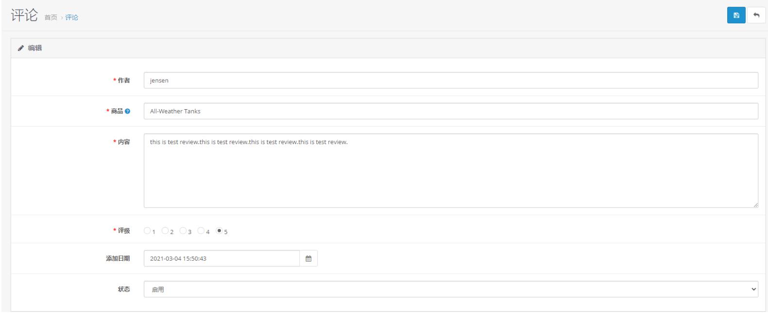 客户前台评论产品后,评论默认是停用状态,需在后台点击修改手动开启。